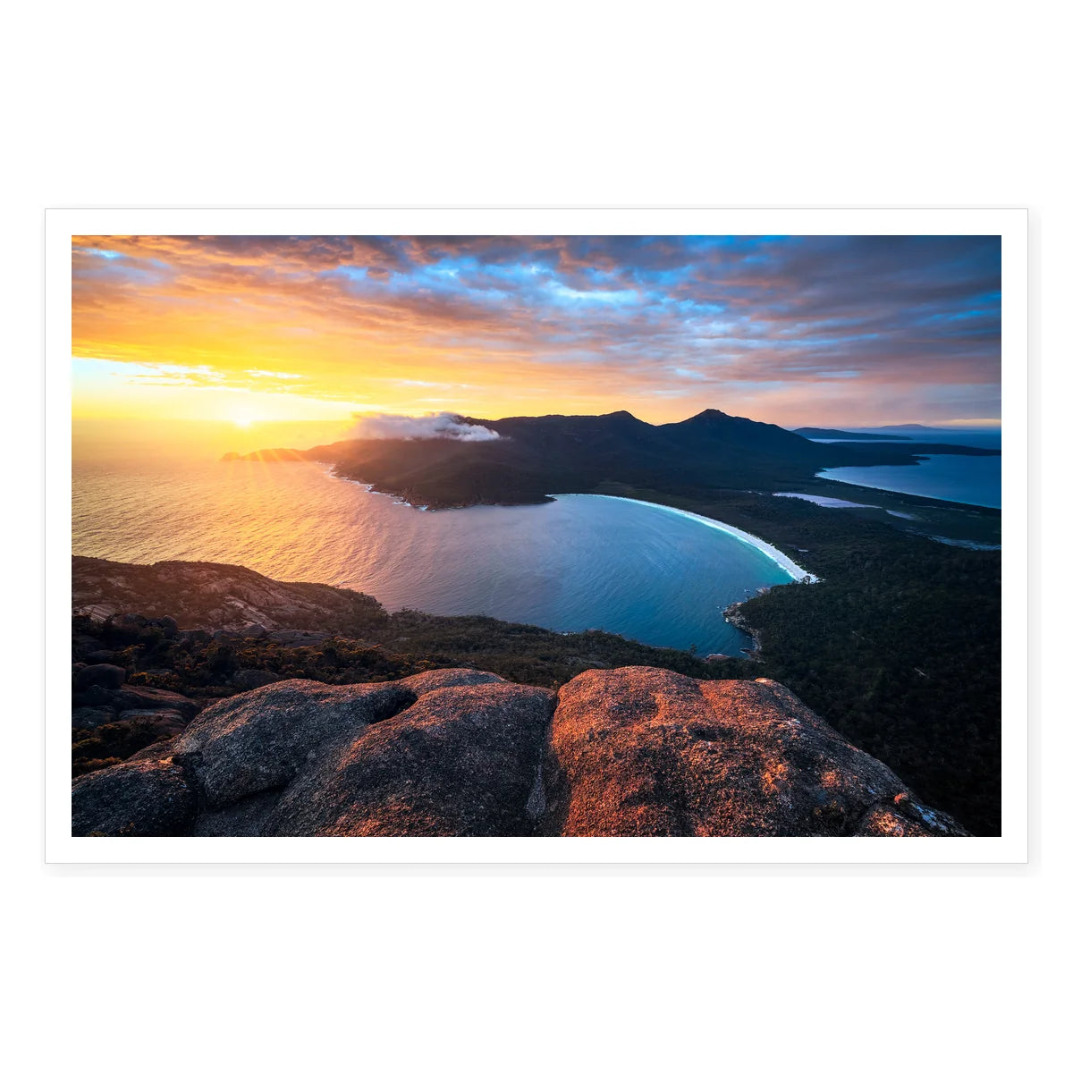 The first light of dawn paints the granite boulders in warm orange tones as Wineglass Bay's perfect crescent stretches below. This elevated view from Mount Amos captures the dramatic coastline of the Freycinet Peninsula, where turquoise waters meet white sand beaches and rocky headlands. The early morning sun transforms the East Coast landscape, creating a stunning display of natural beauty across sea, stone, and sky.