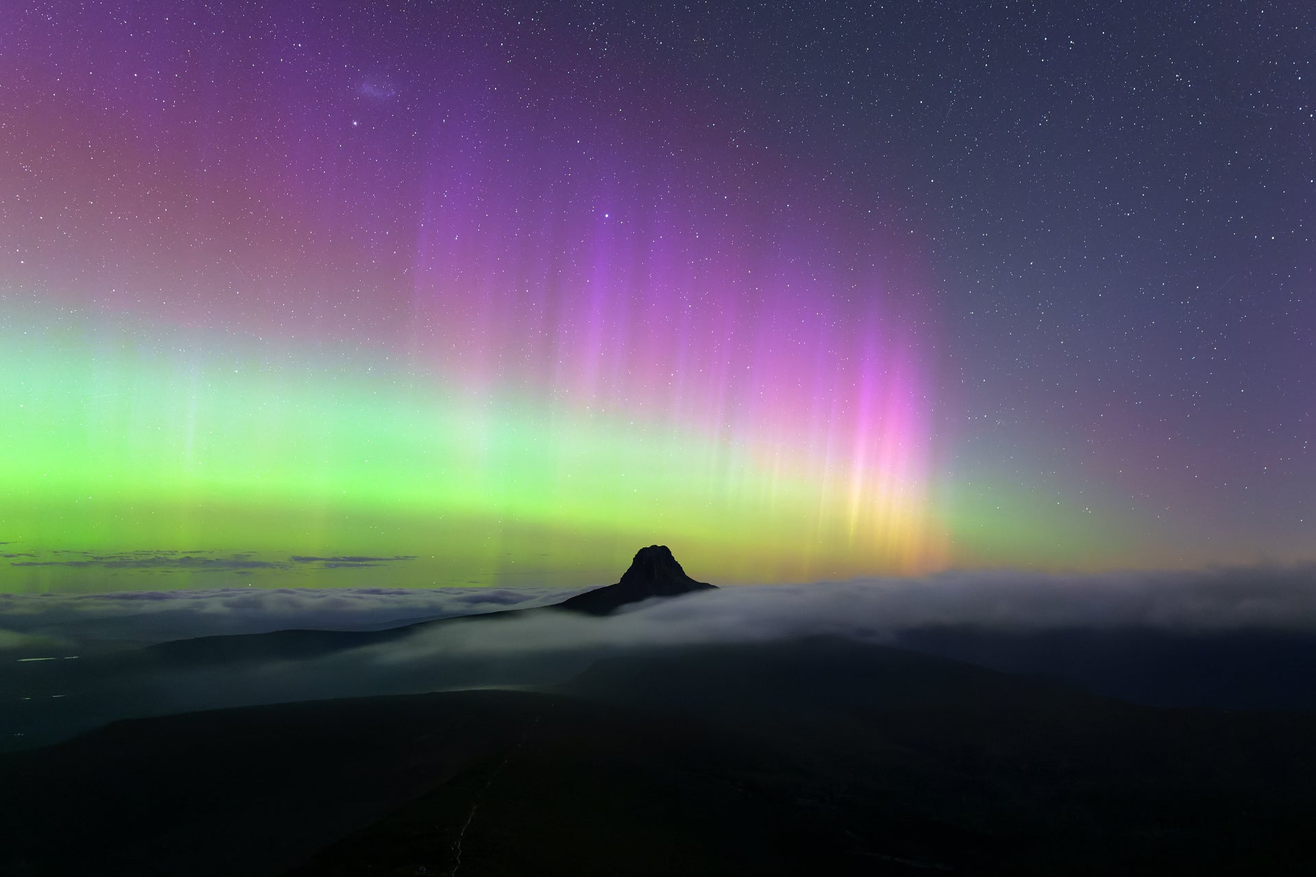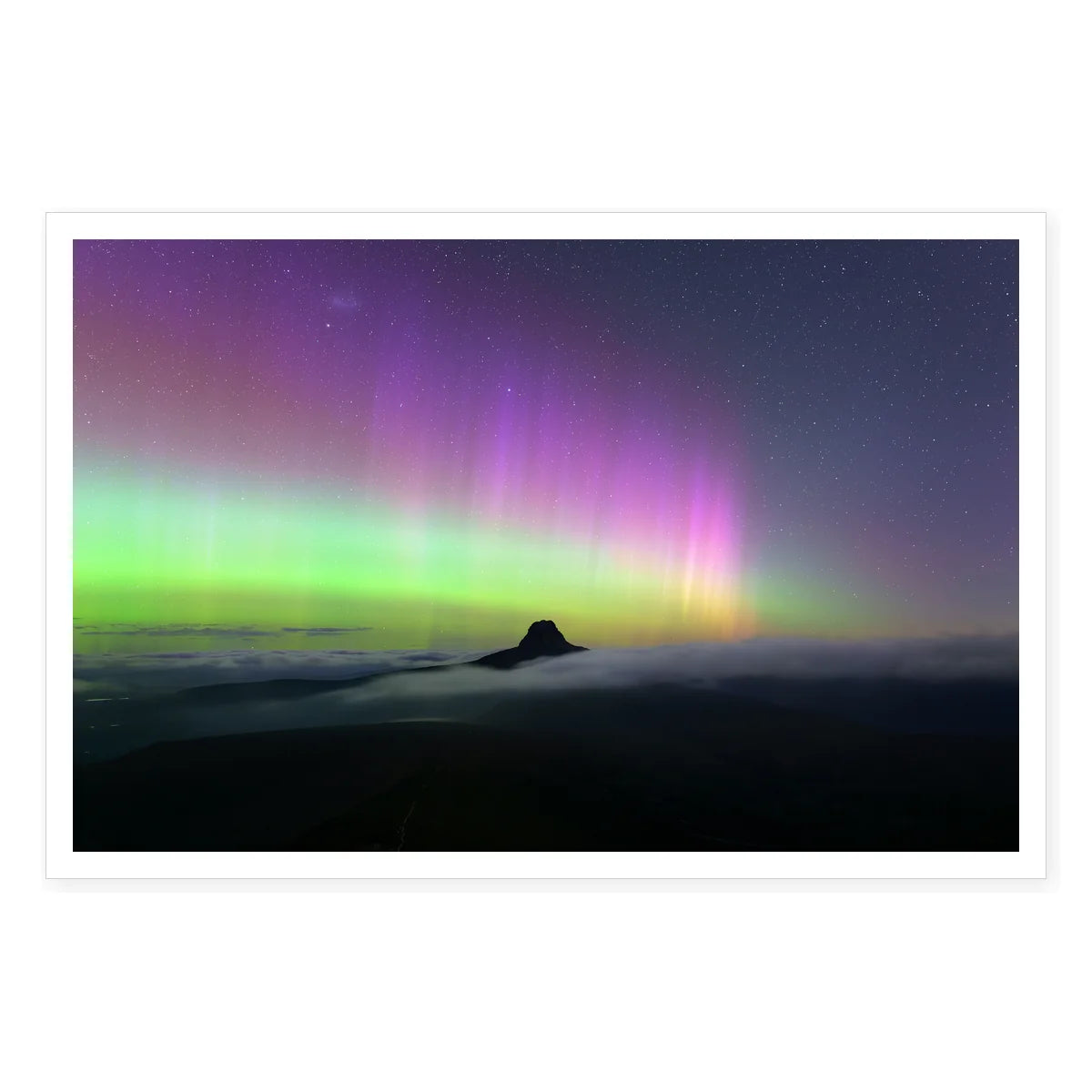 The aurora australis creates a spectacular display of beams in green, purple and pink, framing the distinctive silhouette of Barn Bluff. Rising above a sea of clouds, the mountain's dark outline contrasts dramatically with the dancing lights. These auroral rays, a result of solar particles interacting with Earth's magnetic field, showcase one of Tasmania's most remarkable natural phenomena.
