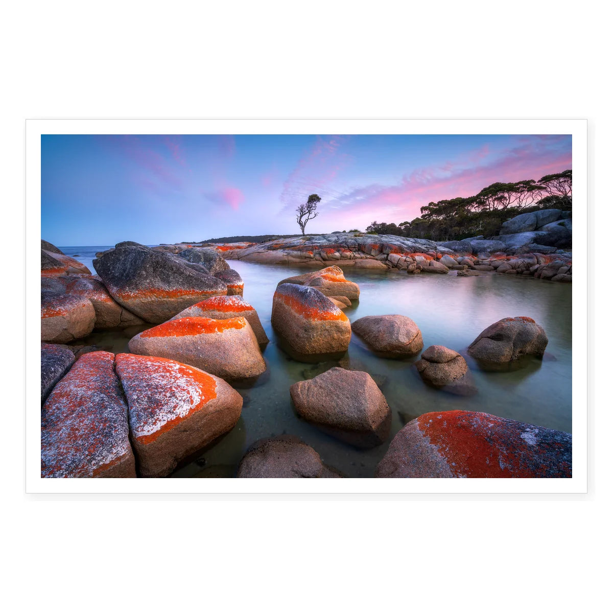 A wind pruned tree at sunset near Binalong Bay in the Bay of Fires region on the east coast of Tasmania.