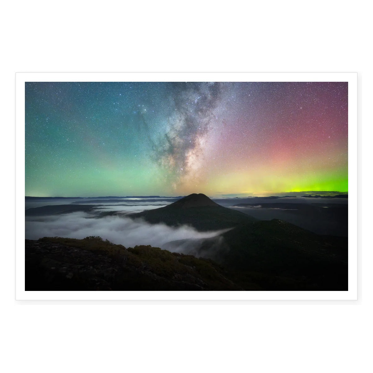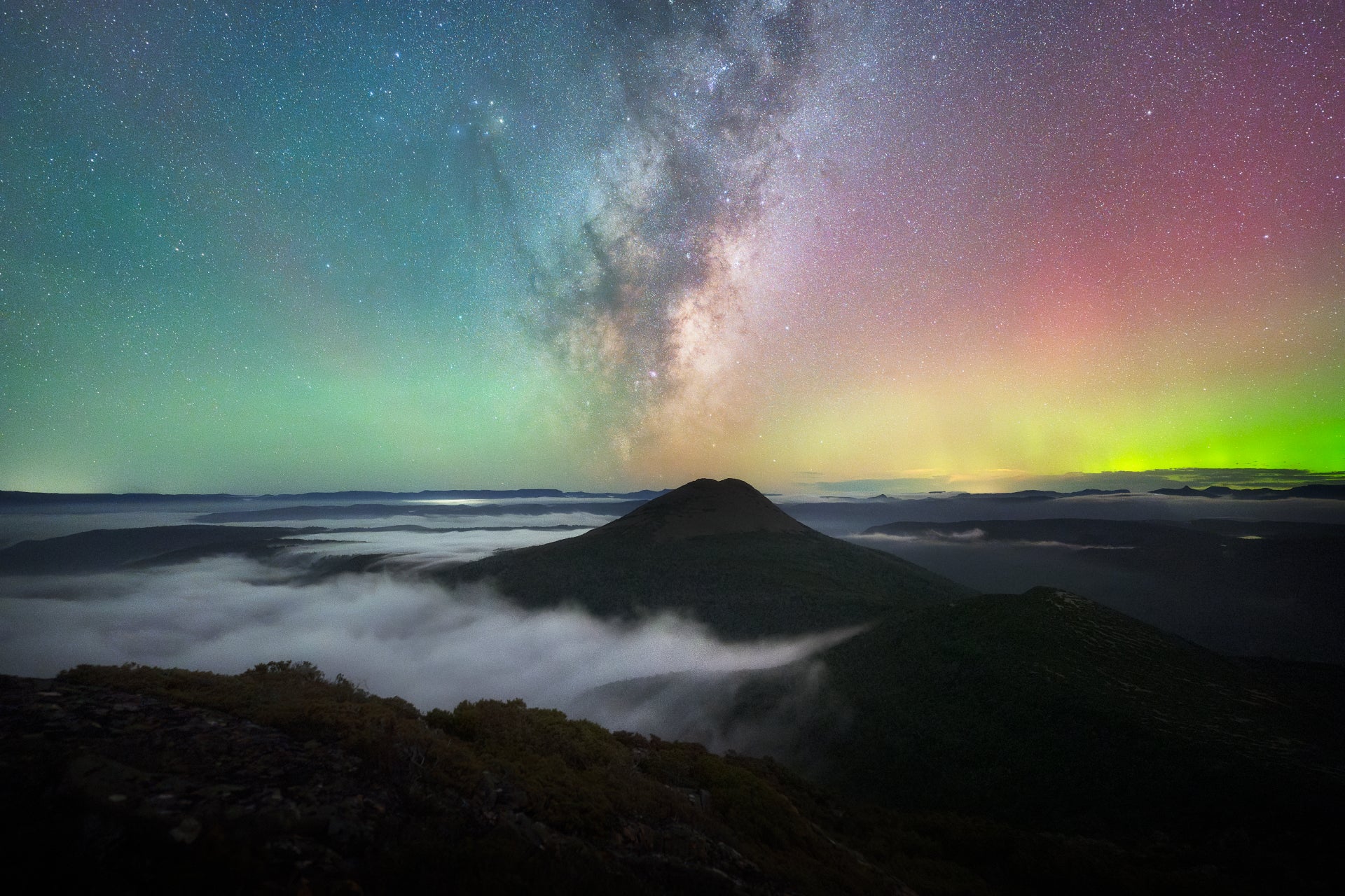 The milky way rising over Mount Emmett during a night with a particularly colourful sky. The airglow on the left mixing with the aurora on the right, and to top it off a cloud inversion down in the valley for dramatic effect.