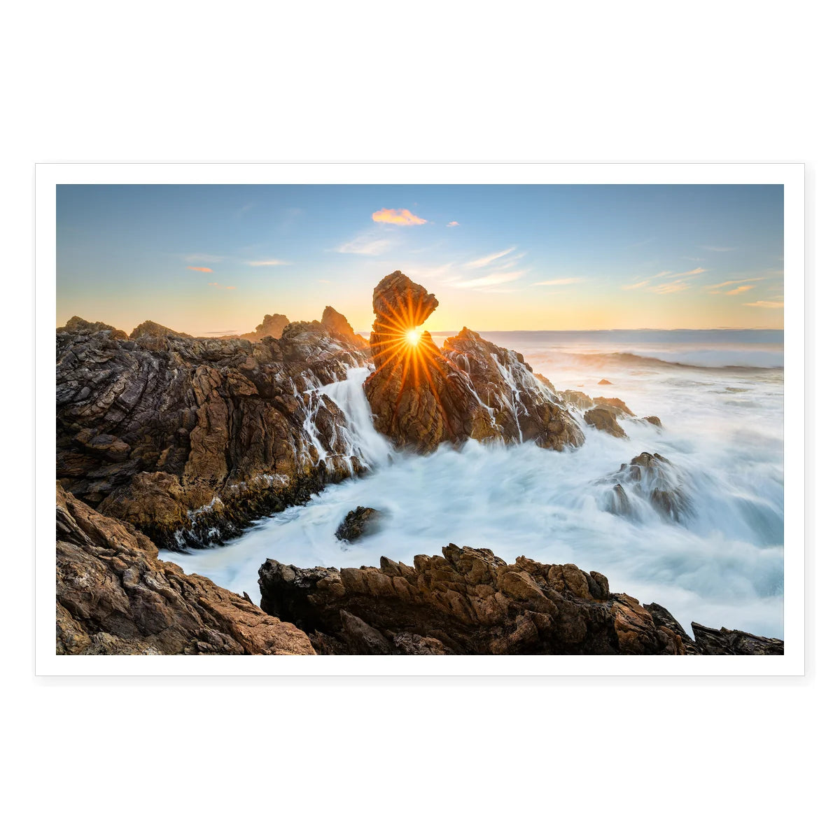 The sun sets along the rugged takayna / Tarkine coast, with direct light creating diffraction spikes which ring a notch in the rock. Heavy seas break along the rock shelf sending foamy water and sea spray skyward.