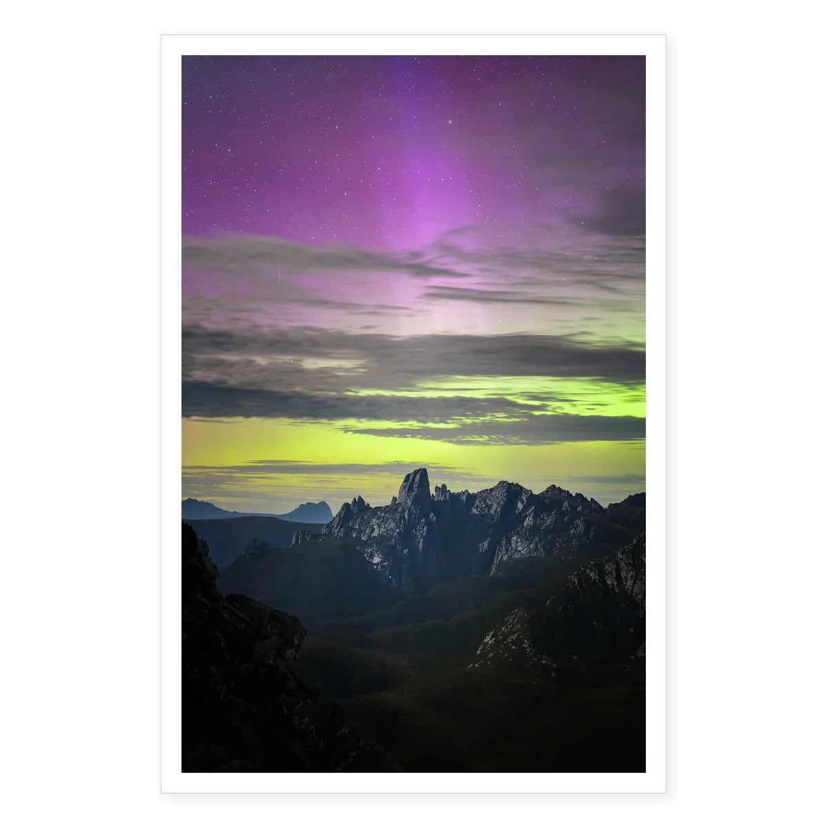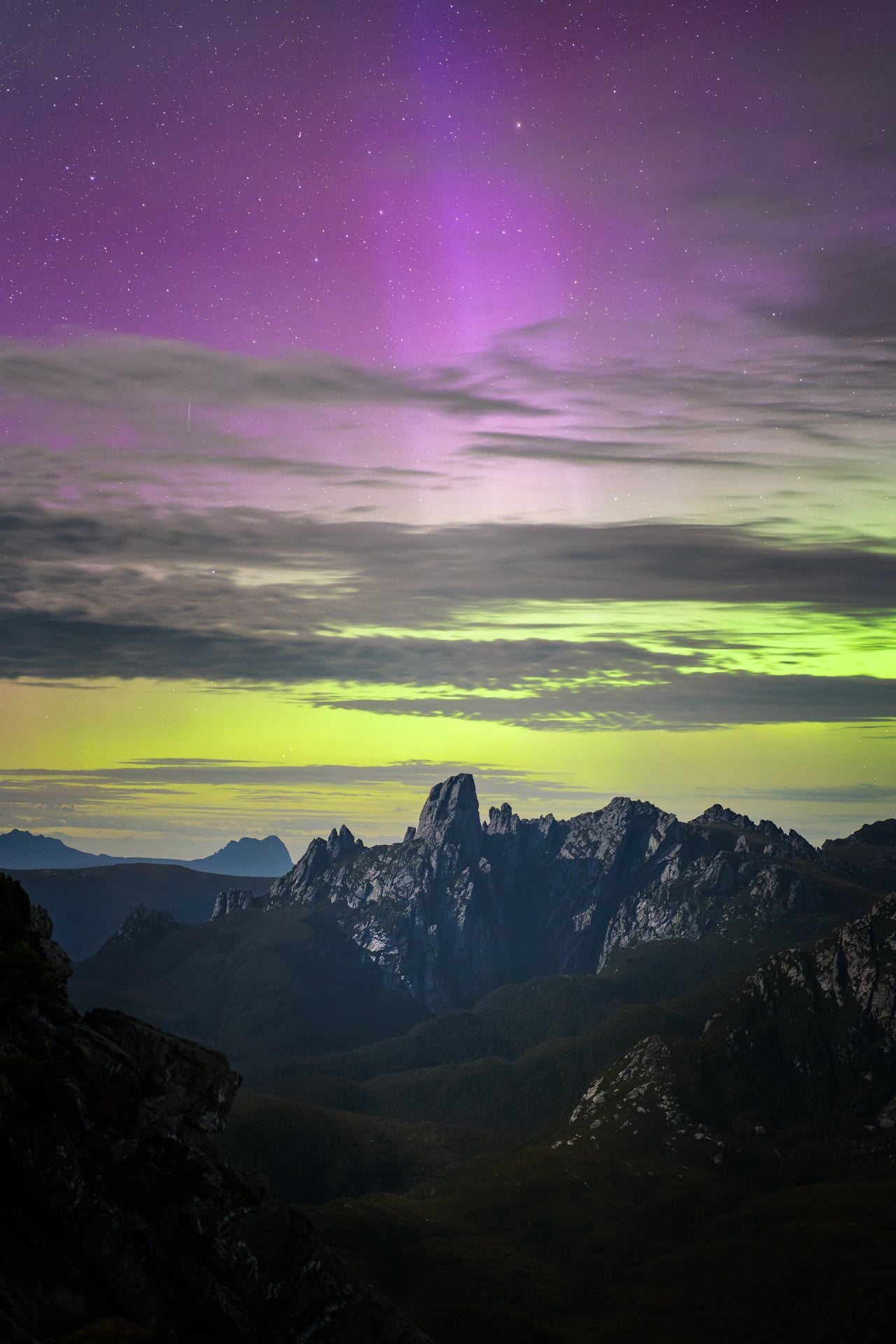 A bright purple ray appears above Federation Peak during a spectacular display of the aurora australis over the Eastern Arthur Range.