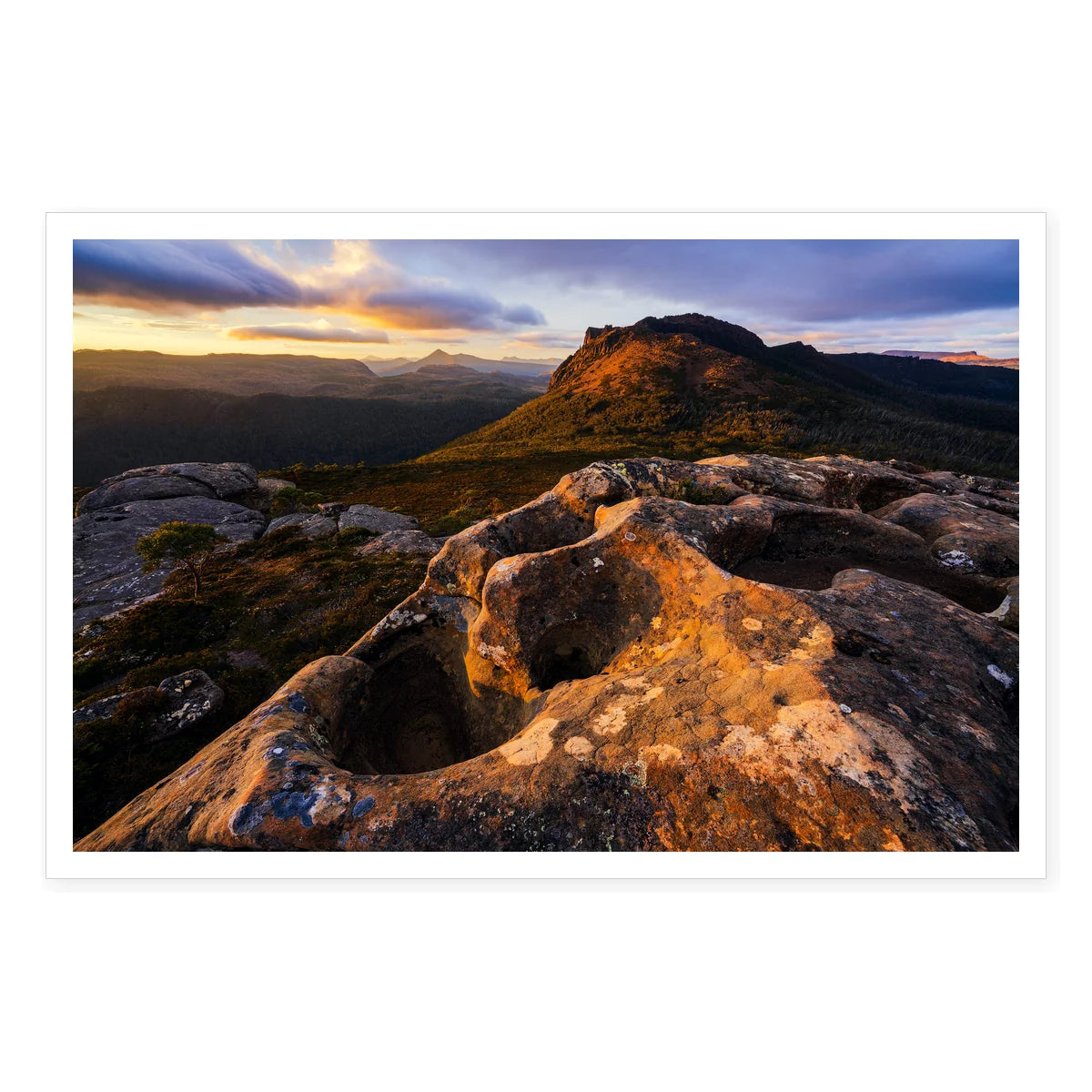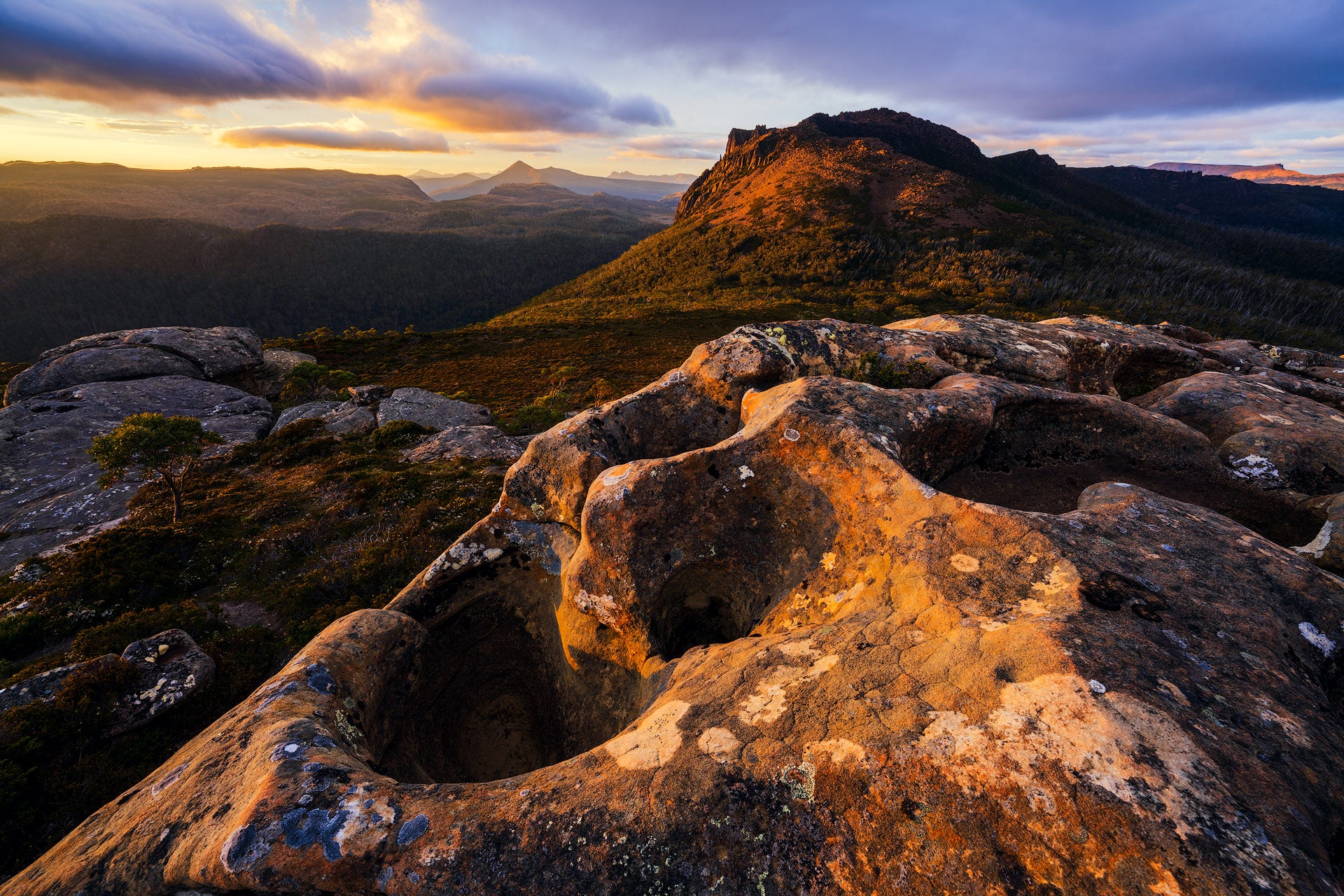 Brilliant sunset light illuminates an eroded sandstone cliff looking toward Mount Hugel and the Tasmanian high country beyond.