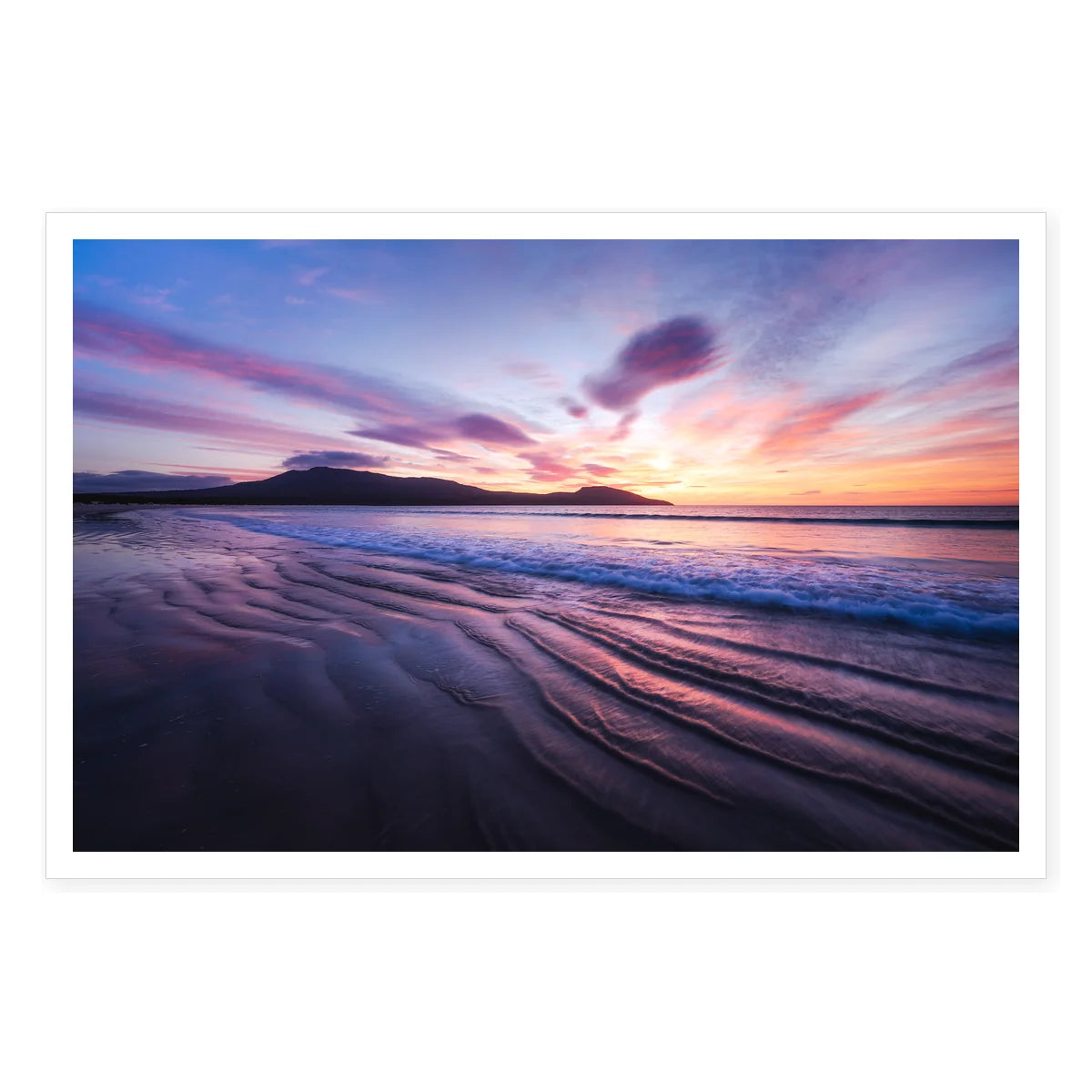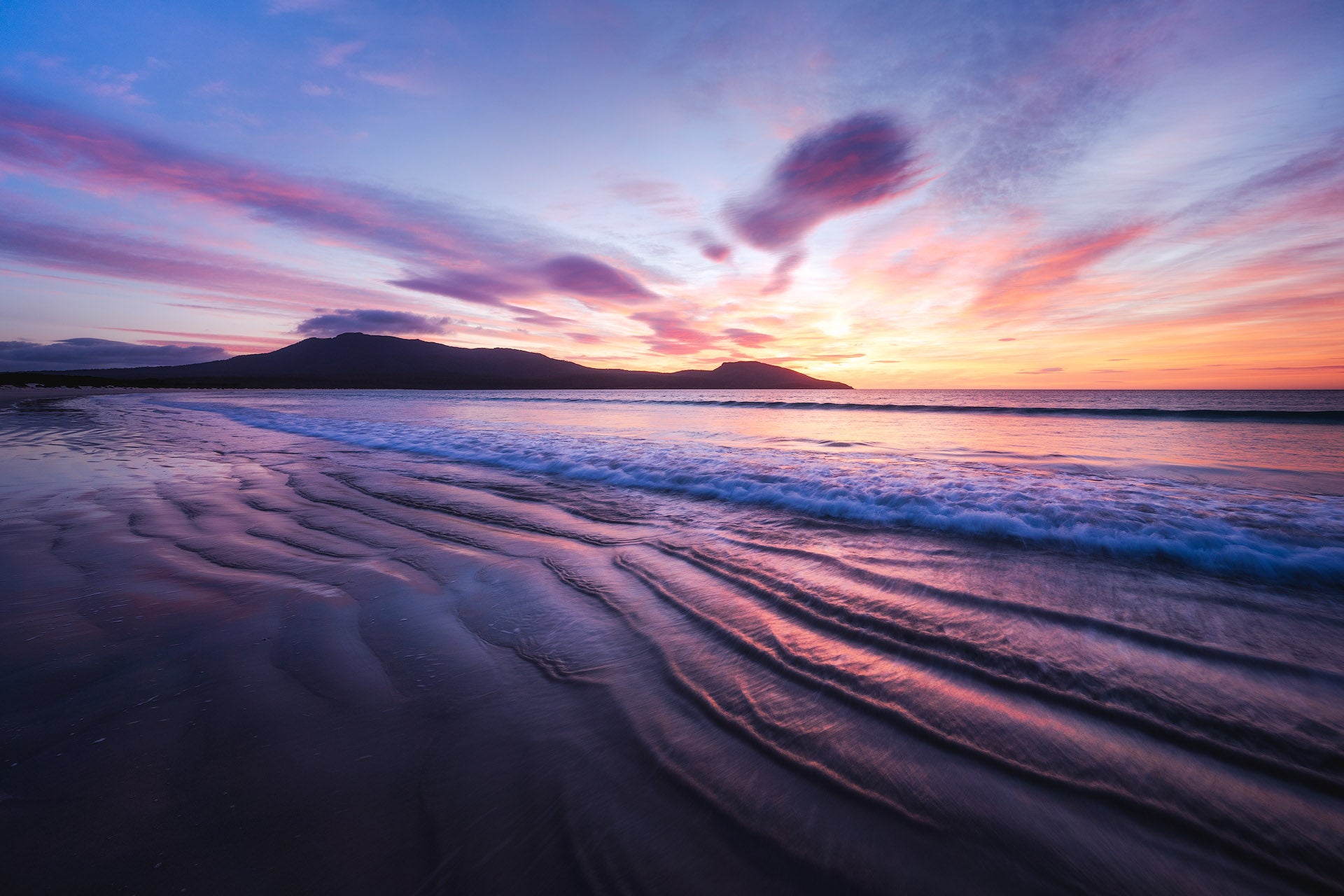 A stunning sunrise is reflected in the ripples on a beach looking toward Mount Maria.