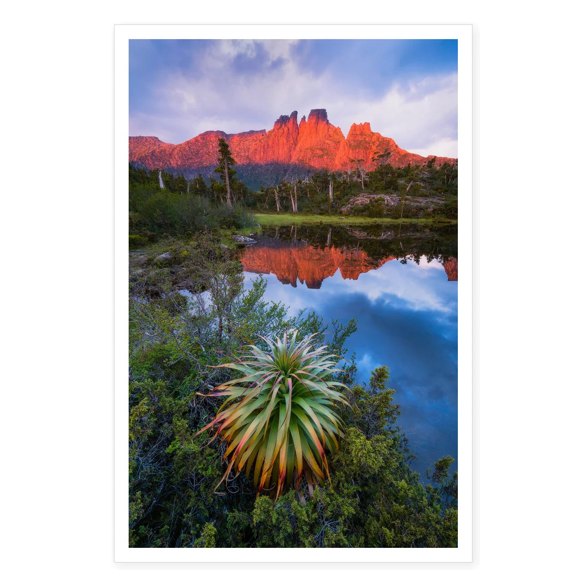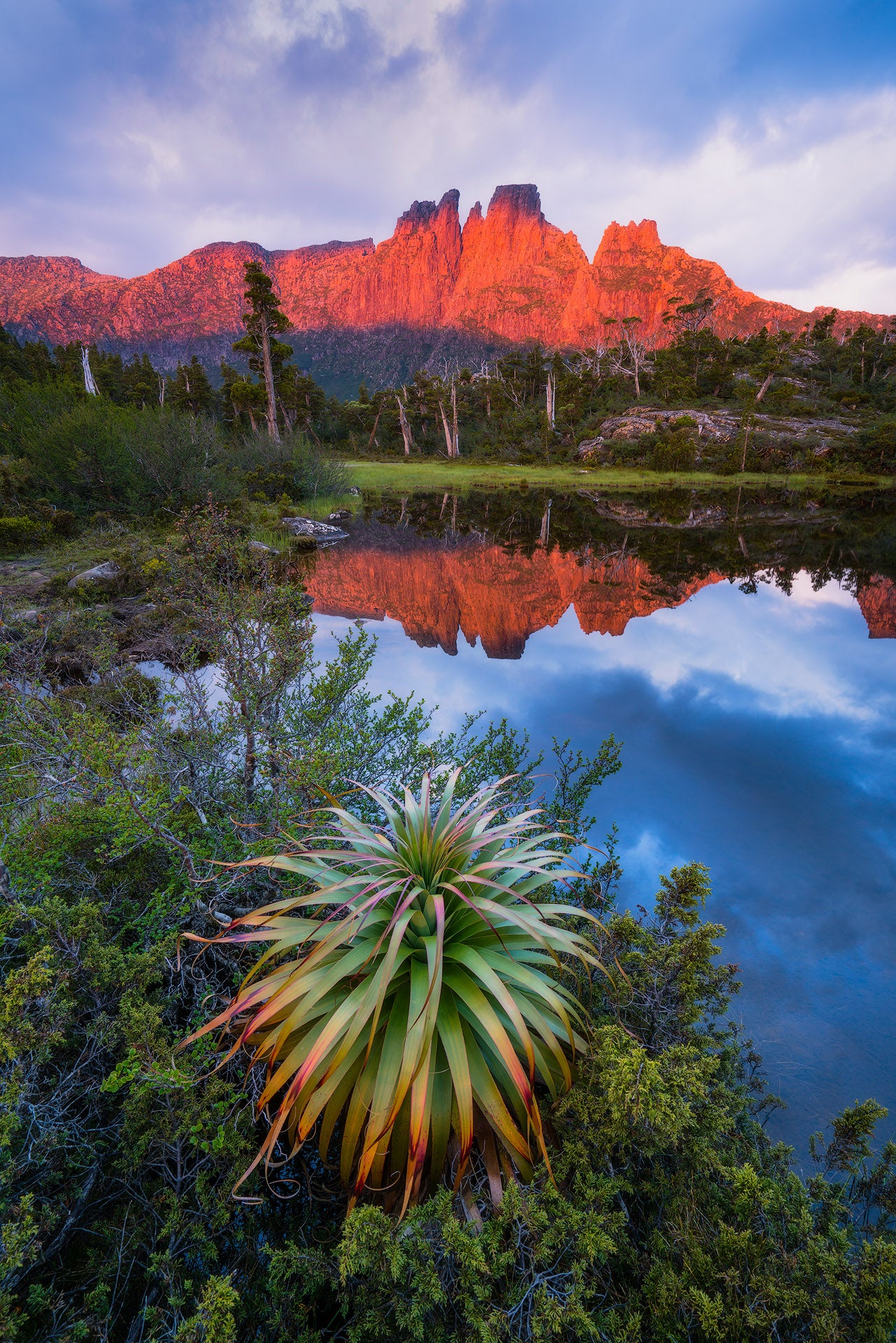 A lone pandani (Richea pandanifolia), the world's tallest heath plant, stands sentinel by the Pool of Memories as Mt Geryon's dolerite spires catch the alpine sunrise. Endemic to Tasmania's highlands, these ancient plants are living remnants of Gondwana. The still waters perfectly mirror the towering peaks of the Du Cane Range, creating a natural reflection pool in this remote alpine basin.