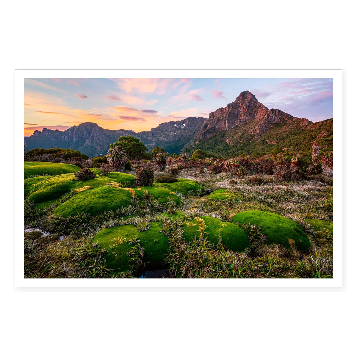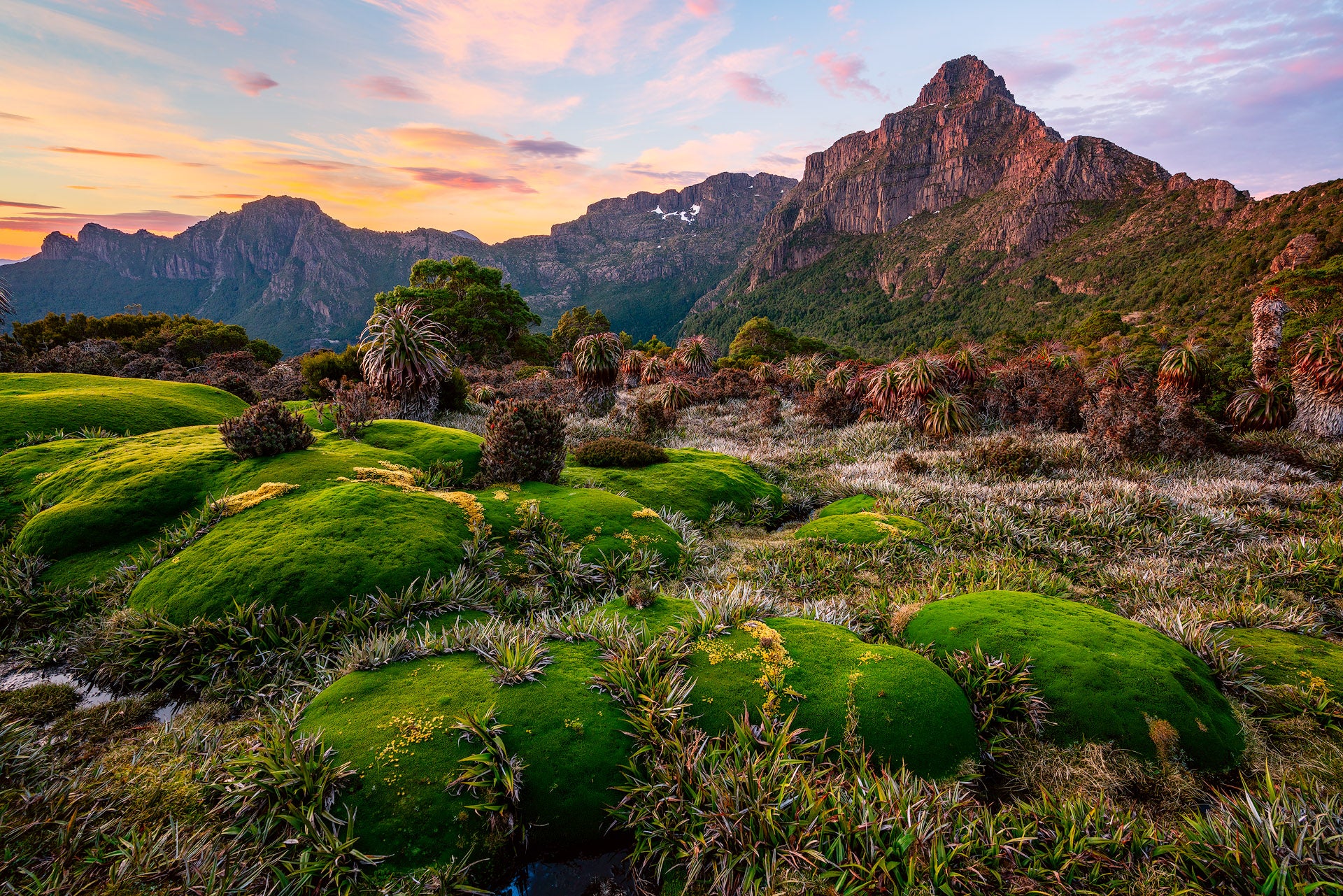 An incredible sunrise over the dolerite peaks of Southwest National Park, with a foreground full of cushion plants and pineapple grass.