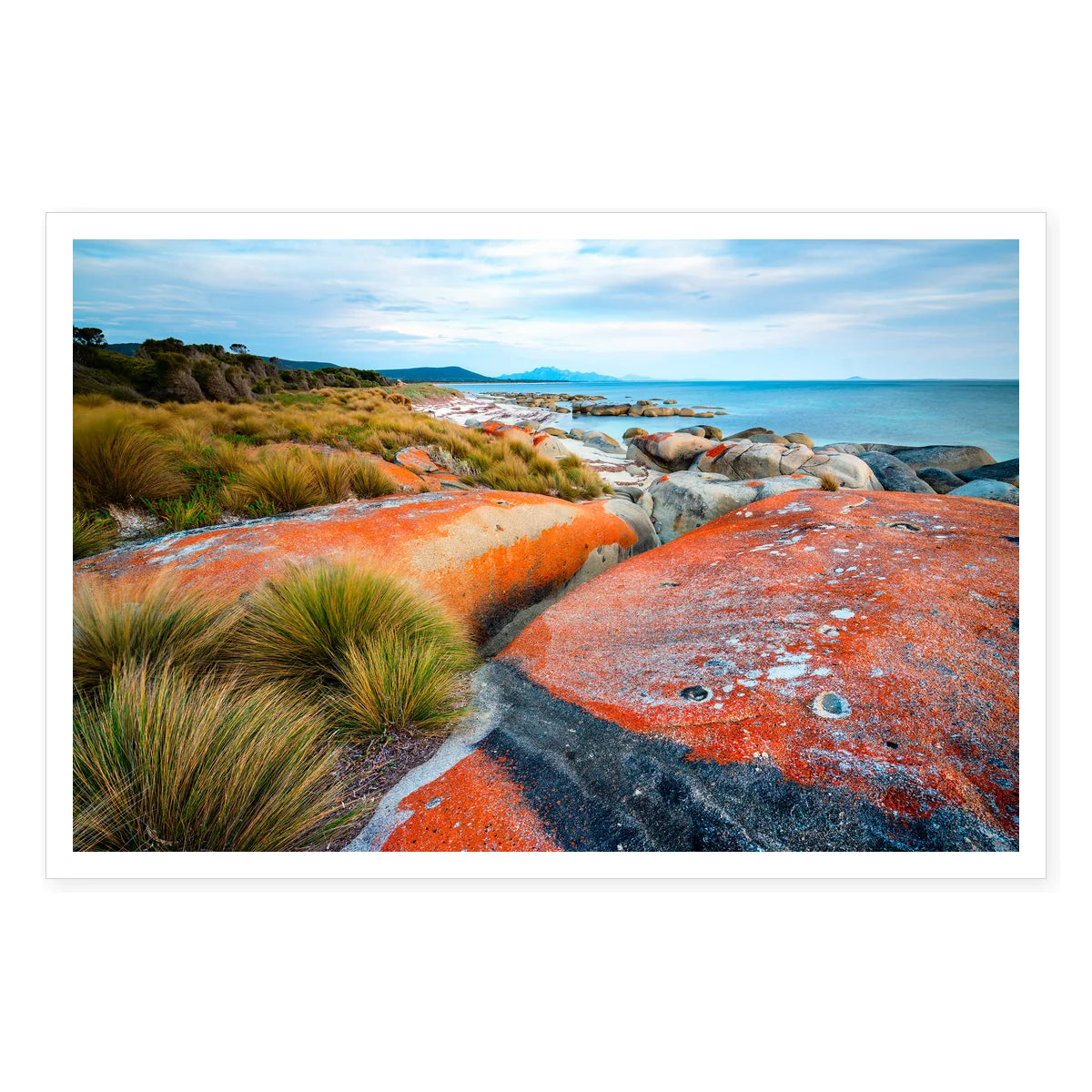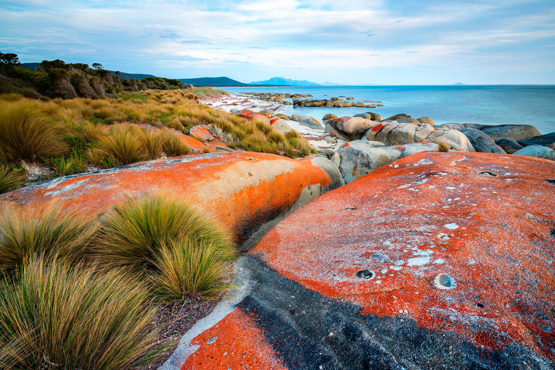 Vivid orange lichen adorns the granite boulders along Sawyers Bay on Flinders Island. Native tussock grasses frame the coastline where the turquoise waters of Bass Strait meet the shore. The distant mountains of the Strzelecki Ranges create a striking backdrop to this remote Tasmanian landscape.
