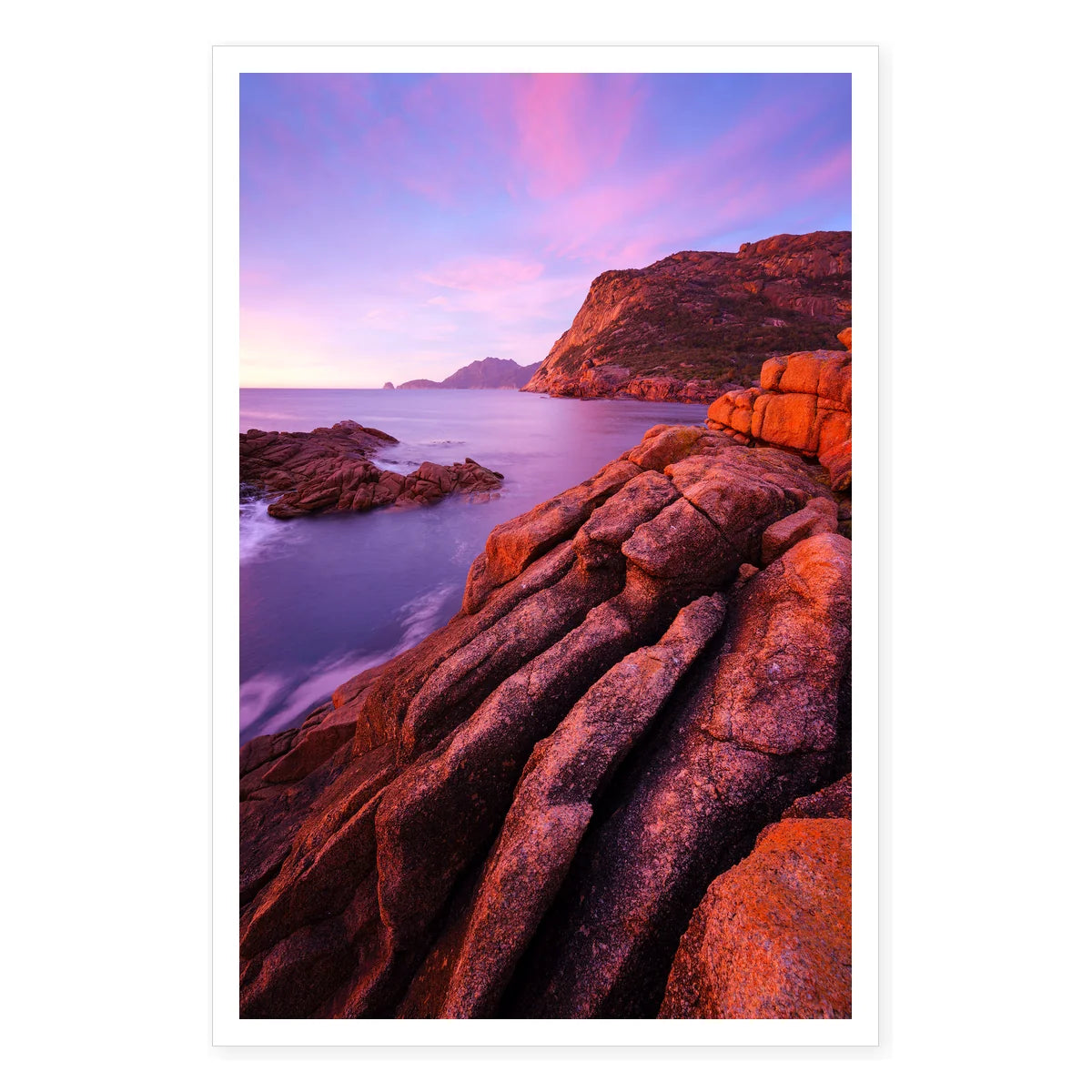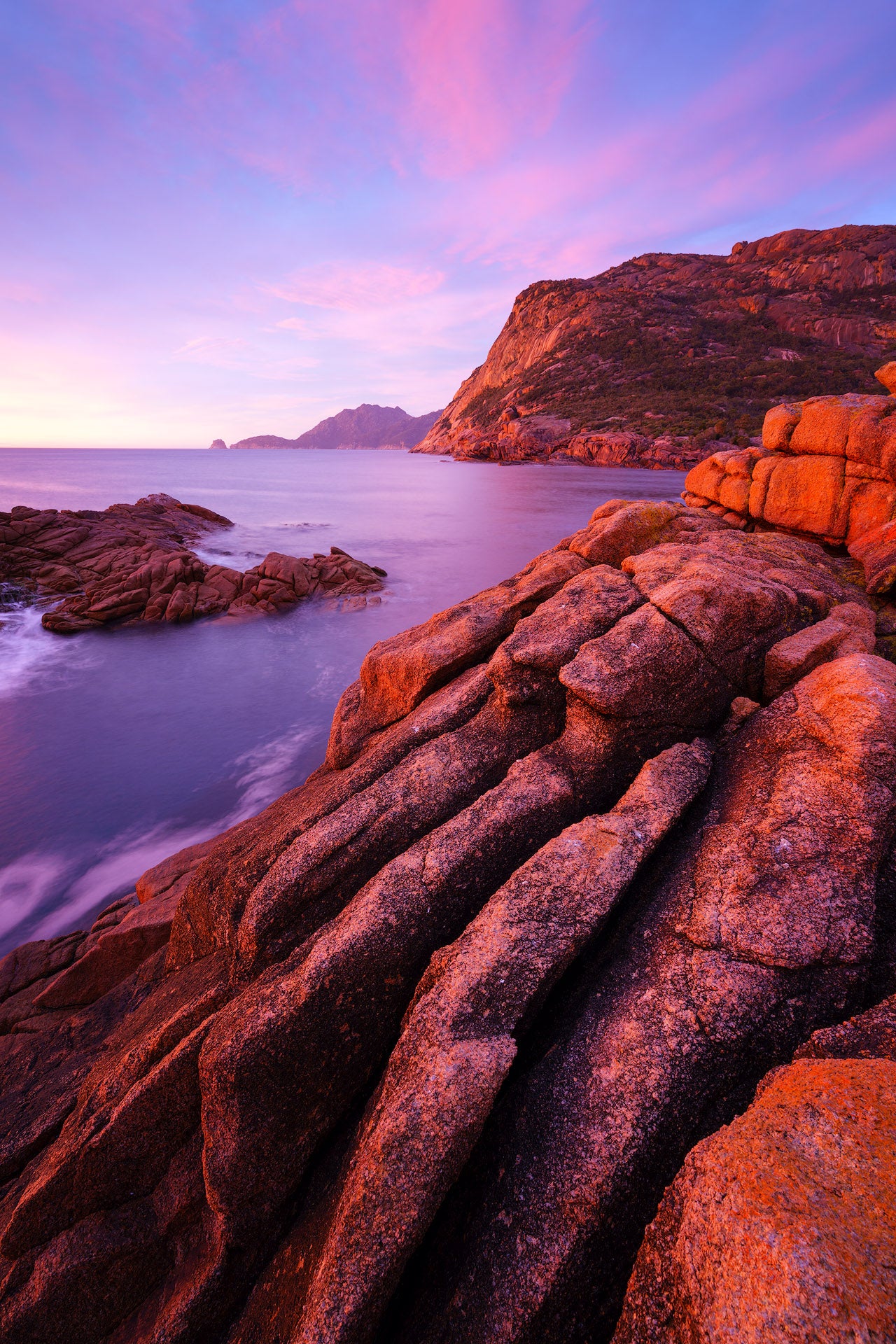 Vivid sunrise colours illuminate the weathered granite at Sleepy Bay.